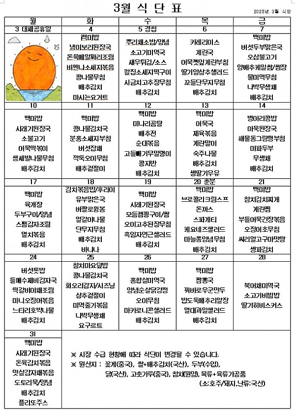 2025년 3월 식단표 ^^