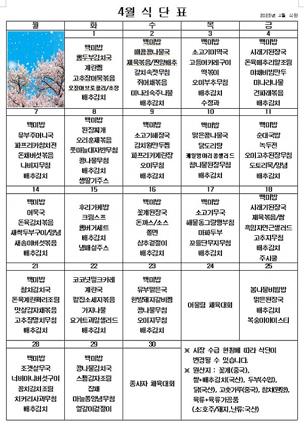 2025년 4월 식단표 ^^ 페이지 정보 작성자 관리자 작성일25-03-28 09:03 조회1,835회 댓글0건 이전글 다음글 목록 본문 4월에도 맛있게 먹고 힘 내서 열심히 일하겠습니다! ^^ 이전글 다음글 목록