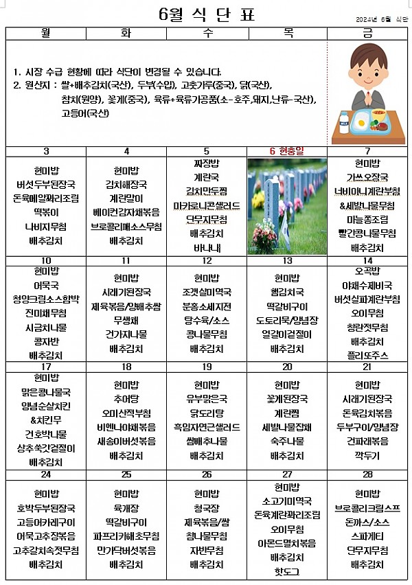 2024년 6월 식단표 ^^ 페이지 정보 작성자 관리자 작성일24-05-30 18:47 조회3,966회 댓글0건 이전글 다음글 목록 본문 여름이 왔습니다! 여름이 왔어요! 땀이 나서 덥고 힘들지만 맛있게 먹고 힘 내서 6월도 잘 이겨내보겠습니다 ~^^ 이전글 다음글 목록