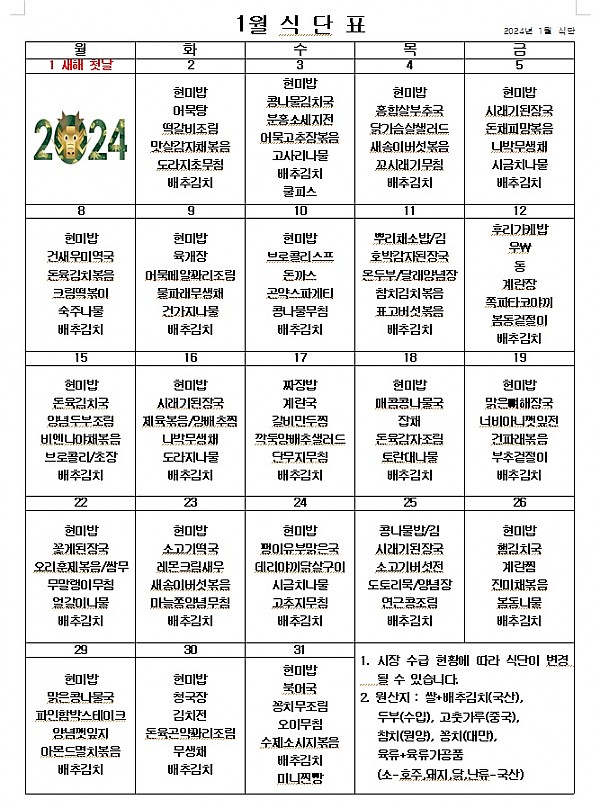 2024년 1월 식단표 ^^ 페이지 정보 작성자 관리자 작성일23-12-28 15:30 조회4,336회 댓글0건 이전글 다음글 목록 본문 갑진년 새해가 밝았습니다. 맛있게 먹고 힘 내서 건강한 한 해를 보내려고 합니다. ^^ 이전글 다음글 목록