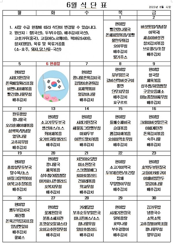 2023년 6월 식단표 ^^ 페이지 정보 작성자 관리자 작성일23-06-05 14:21 조회4,458회 댓글0건 이전글 다음글 목록 본문 무더운 여름이 찾아왔습니다. 덥지만 맛있게 먹고 힘내서 싱그러운 6월을 잘 보내겠습니다. ^^ 이전글 다음글 목록