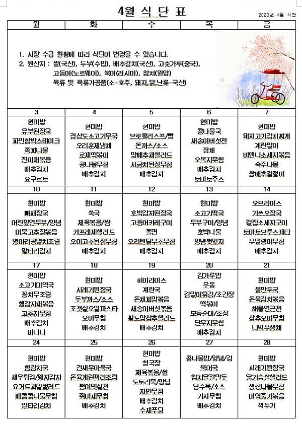 2023년 4월 식단표 ^^ 페이지 정보 작성자 관리자 작성일23-03-30 15:59 조회4,473회 댓글0건 이전글 다음글 목록 본문 자조모임 의견에서 나온 희망 식단, 희망 간식을 최대한 반영해보려고 했습니다. ^^ 4월에도 맛있게 먹고 힘 냅시다! 이전글 다음글 목록