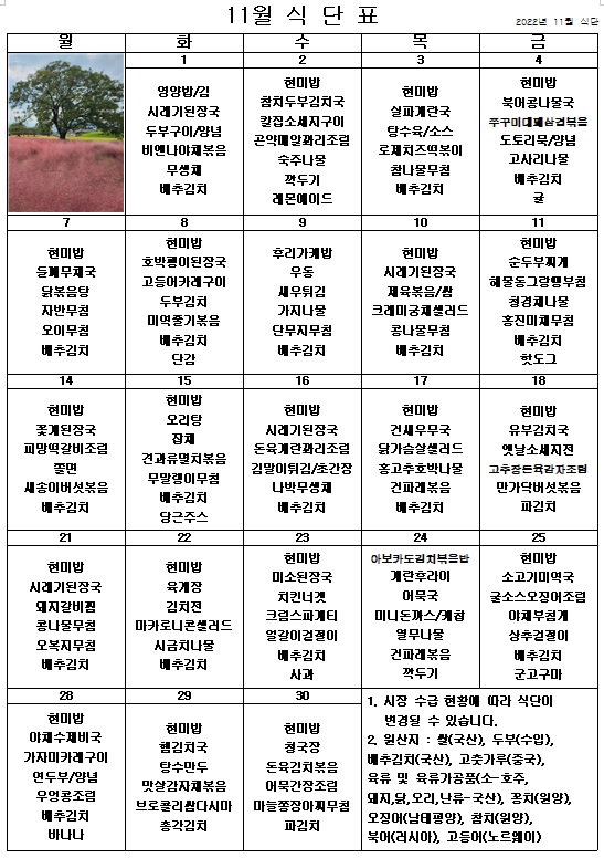 2022년 11월 식단표 ^^ 페이지 정보 작성자 관리자 작성일22-10-31 18:33 조회4,661회 댓글0건 이전글 다음글 목록 본문 11월에는 우리 가족들의 의견을 최대한 많이 반영해보도록 하겠습니다. 맛있게 먹고 건강하게 생활합시다! ^^ 이전글 다음글 목록