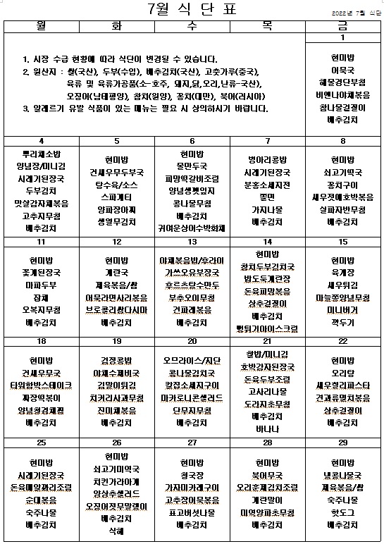 2022년 7월 식단표 ^^ 페이지 정보 작성자 관리자 작성일22-07-14 09:28 조회4,567회 댓글0건 이전글 다음글 목록 본문 무더운 여름이지만 식중독 발생에 주의하면서 맛있고 안전한 식단을 제공하도록 노력하겠습니다. 이전글 다음글 목록