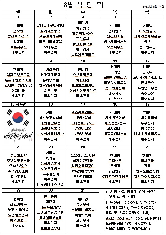 2022년 8월 식단표 ^^ 페이지 정보 작성자 관리자 작성일22-08-01 09:35 조회4,533회 댓글0건 이전글 다음글 목록 본문 무더운 여름이지만 식중독에 주의하면서 깨끗하고 맛있는 음식을 제공해드리도록 하겠습니다! ^^ 이전글 다음글 목록
