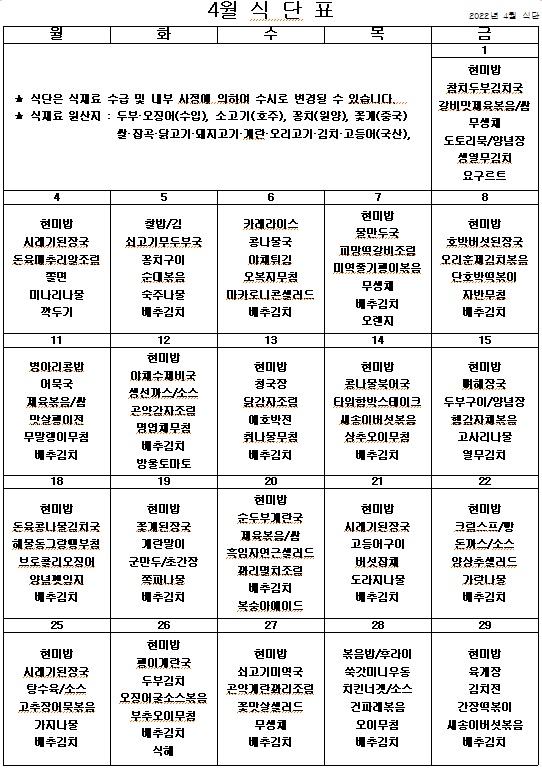 2022년 4월 식단표 ^^ 페이지 정보 작성자 관리자 작성일22-03-30 19:12 조회4,864회 댓글0건 이전글 다음글 목록 본문 코로나가 아무리 심해져도 우리의 열정을 막을순 없죠. 맛있고 건강한 식단으로 힘을 내서 슬기롭게 코로나를 이겨내보아요. ^^ 이전글 다음글 목록