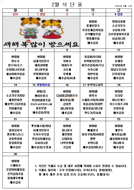 2022년 2월 식단표 ^^ 페이지 정보 작성자 관리자 작성일22-01-27 15:59 조회4,883회 댓글0건 이전글 다음글 목록 본문 맛있게 먹고 힘을 내서 코로나를 이겨내봐요! ^^ 이전글 다음글 목록