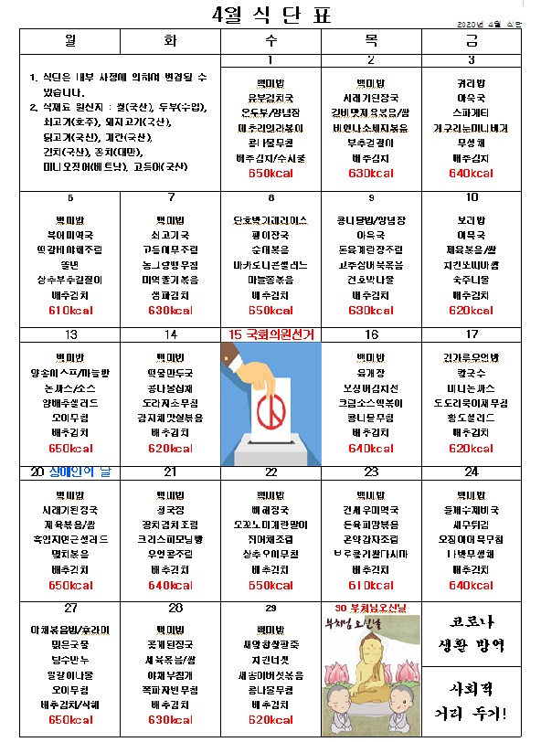 2020년 4월 식단 페이지 정보 작성자 관리자 작성일20-04-01 18:28 조회5,589회 댓글0건 이전글 다음글 목록 본문 코로나 바이러스를 잘 이겨냅시다! 사회적 거리 두기 실천 식후 식당 방역 소독 철저 이행 이전글 다음글 목록