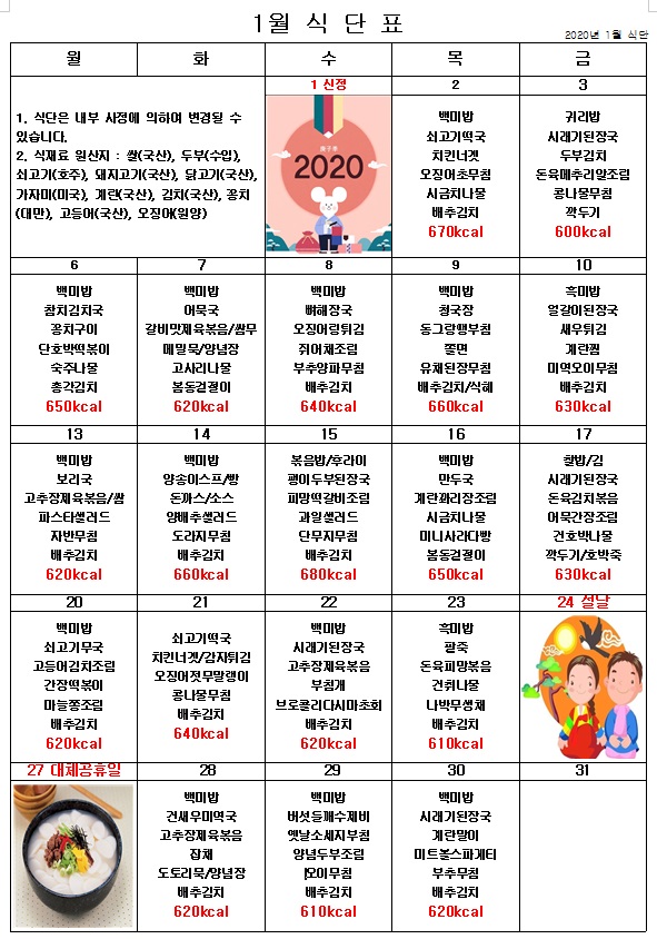 2020년 1월 식단표
