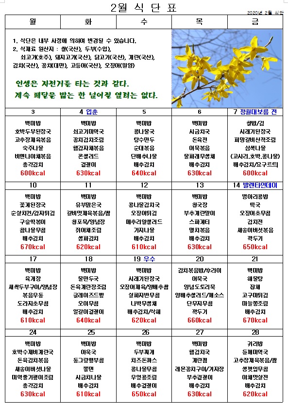 2020년 2월 식단표 페이지 정보 작성자 관리자 작성일20-02-03 19:04 조회5,469회 댓글0건 이전글 다음글 목록 본문 즐거운 점심시간 ^^ 맛있는 음식으로 활기찬 하루를 보내요! 이전글 다음글 목록