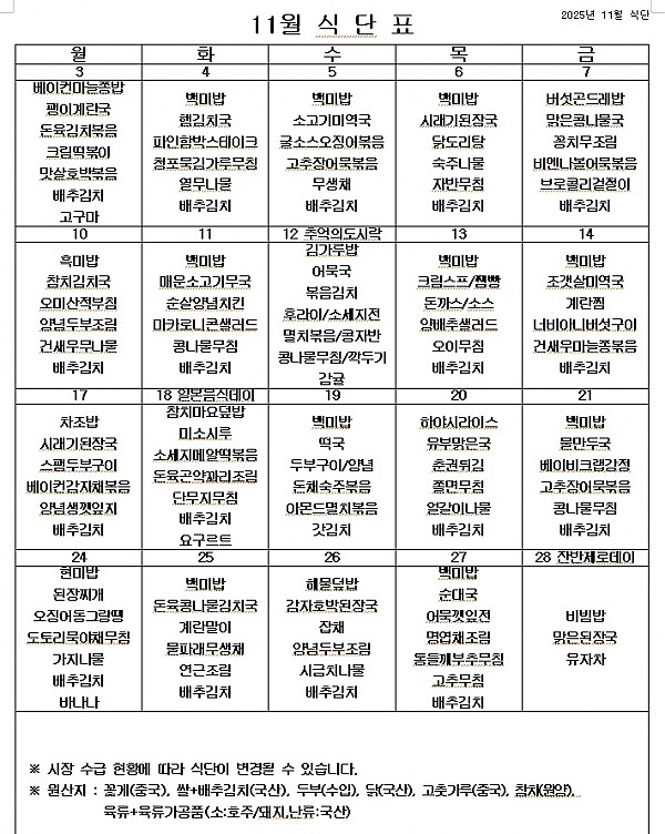 2025년 11월 식단표 ^^ 페이지 정보 작성자 관리자 작성일25-10-31 08:48 조회1,127회 댓글0건 이전글 다음글 목록 본문 11월에도 영양가 있고 맛있는 건강 식단을 먹으면서 열심히 달려보겠습니다! ^^ 이전글 다음글 목록