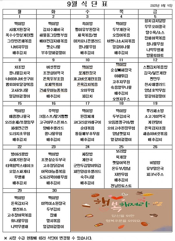 2025년 9월 식단표 ^^ 페이지 정보 작성자 관리자 작성일25-08-28 18:17 조회1,452회 댓글0건 이전글 다음글 목록 본문 처서가 지났지만 아직 무더위가 기승을 부리고 있습니다. 9월에도 맛있게 먹고 힘내서 즐겁게 일하겠습니다. 이전글 다음글 목록
