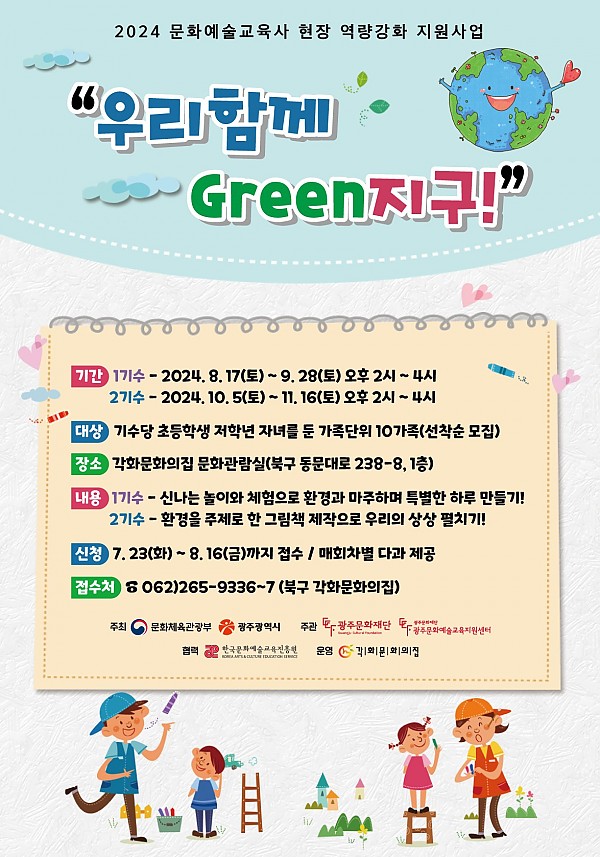 각화문화의집 '우리함께 Green지구!' 프로그램 참여자 모집 페이지 정보 작성자 정관용 작성일24-08-01 17:58 조회4,920회 댓글0건 이전글 다음글 목록 본문 '우리함께 Green지구!' 프로그램 참여자 모집 많은 참여 바랍니다! 이전글 다음글 목록