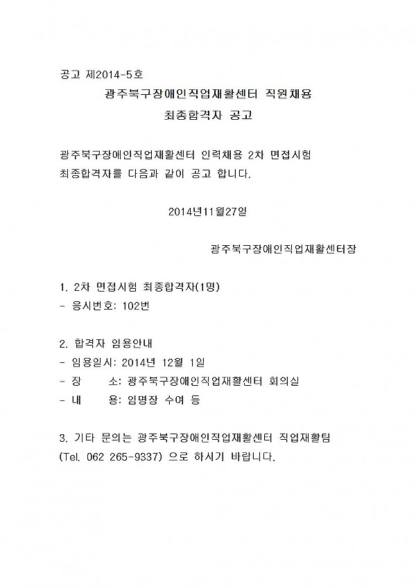 광주북구장애인직업재활센터 직원채용 최종합격자 공고 페이지 정보 작성자 배지연 작성일14-11-27 08:57 조회15,734회 댓글0건 이전글 다음글 목록 본문 광주북구장애인직업재활센터 직원 채용에 관심 가져 주신 모든분들께 감사드립니다. 이전글 다음글 목록