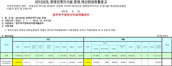 2015년 광주북구장애인직업재활센터 세입세출(예산) 공고 페이지 정보 작성자 배지연 작성일15-03-13 17:44 조회15,980회 댓글0건 이전글 다음글 목록 본문 사회복지법인 재무회계규칙 제10조 제3항의 규정에 의하여 2015년도 장애인복지시설 운영사업 예산편성현황을 다음과 같이 공고합니다. 이전글 다음글 목록