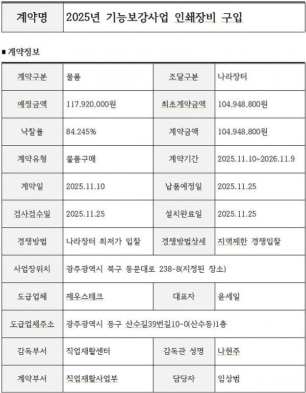 2025년 기능보강사업 인쇄장비 구입 업체 계약 정보공개 페이지 정보 작성자 관리자 작성일25-11-26 11:01 조회3,414회 댓글0건 이전글 다음글 목록 본문 2025년 기능보강사업 인쇄장비 구입 업체 계약 정보공개 이전글 다음글 목록
