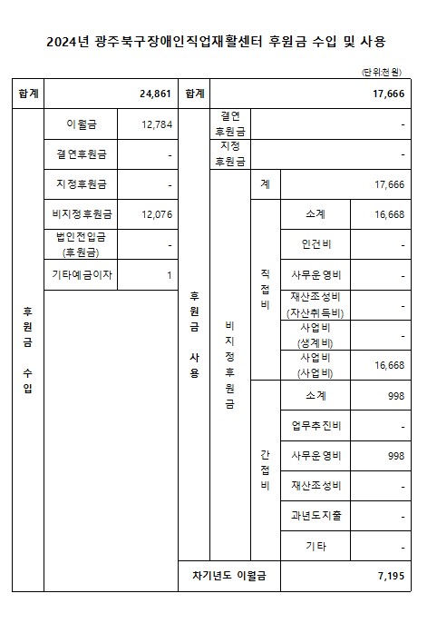 2024년 광주북구장애인직업재활센터 후원금 수입 및 사용내역 공고 페이지 정보 작성자 관리자 작성일25-03-11 16:06 조회9,703회 댓글0건 이전글 다음글 목록 본문 사회복지법인 및 사회복지시설 재무․회계규칙 제41조의 6의 규정에 의거하여 2024년 광주북구장애인직업재활센터 후원금 수입 및 사용 내역을 다음과 같이 공개합니다. 이전글 다음글 목록