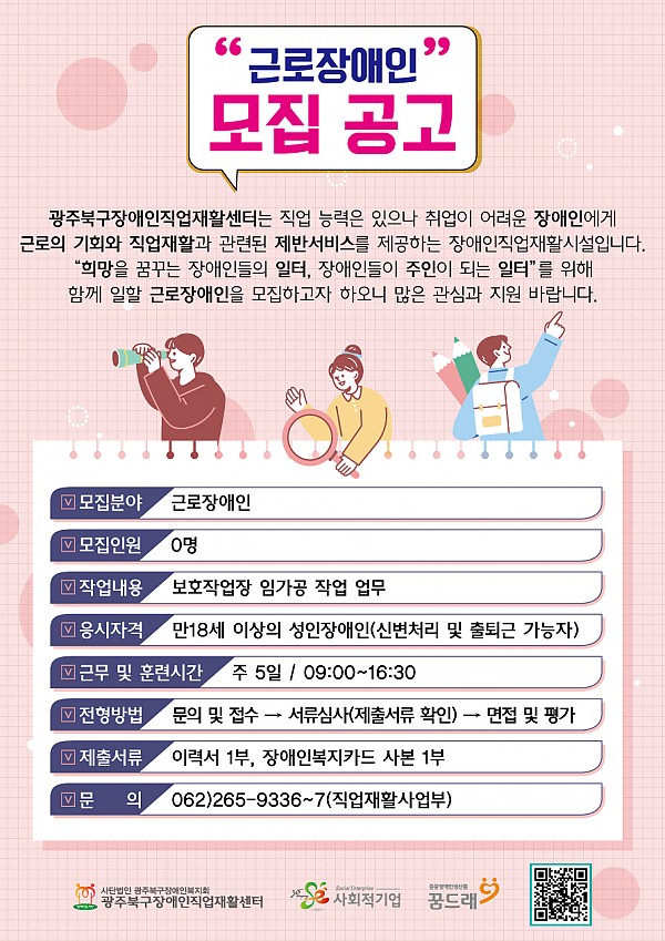근로장애인 모집 공고 페이지 정보 작성자 관리자 작성일24-05-03 15:33 조회14,298회 댓글0건 이전글 다음글 목록 본문 *미싱 작업 가능자 우대* 광주북구장애인직업재활센터에서 함께 일할 근로장애인을 모집합니다. 많은 관심과 참여 부탁드립니다. 이전글 다음글 목록