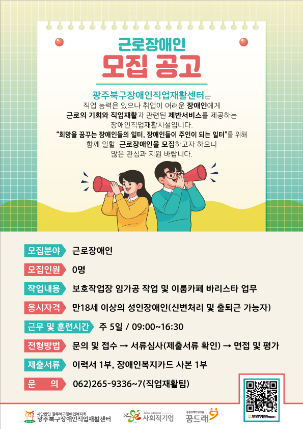 근로장애인 모집공고 페이지 정보 작성자 관리자 작성일23-03-07 09:53 조회14,054회 댓글0건 이전글 다음글 목록 본문 - 함께 근무할 근로장애인을 모집 합니다. - 모집 공고를 보시고 관심있는 분은 연락주시면 감사하겠습니다. (미싱 가능자 우대) 이전글 다음글 목록