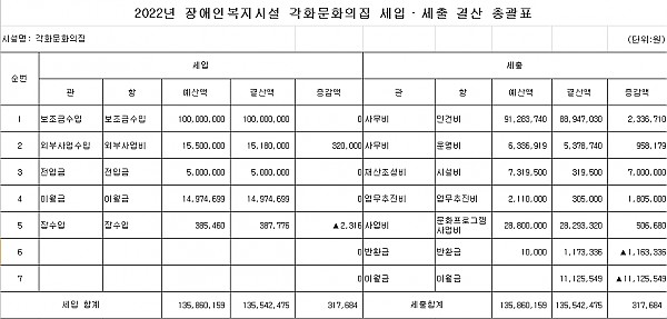 사회복지법인 및 사회복지시설 재무․회계규칙 제 19조 및 제 20조 규정에 의거하여 2022 각화문화의집 세입 및 세출 결산을 다음과 같이 공개합니다.