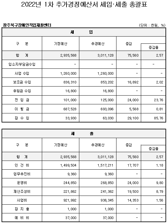 2. 공고사항 : 2022 광주북구장애인직업재활센터 1차 추가경정 세입·세출 예산서