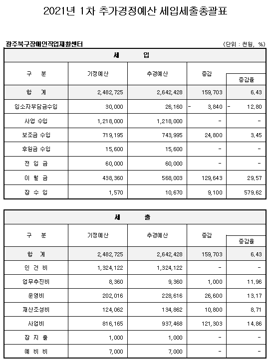 2021년 광주북구장애인직업재활센터 1차 추가경정 세입세출(예산서) 공고