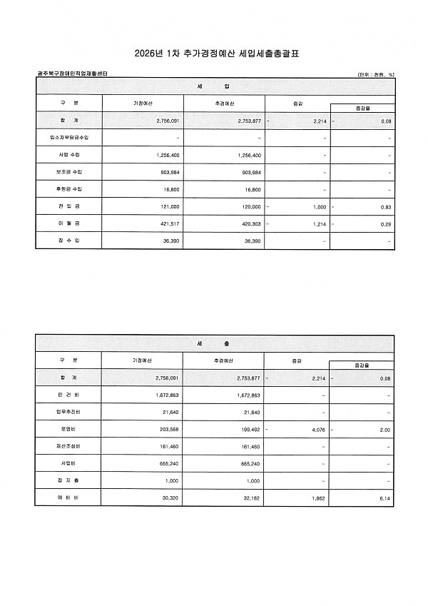 2. 공고사항 : 2026년 광주북구장애인직업재활센터 1차 추가경정 세입·세출 예산서