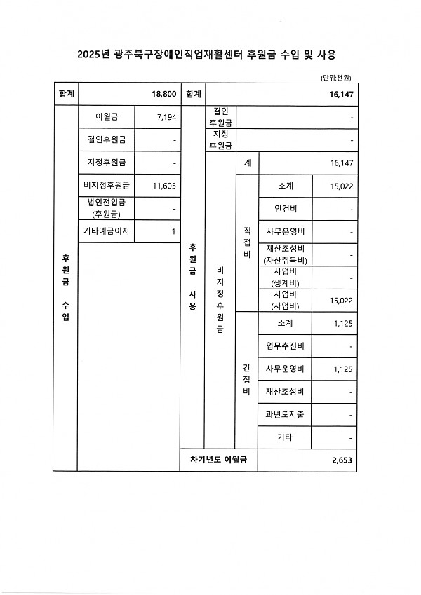2025년 광주북구장애인직업재활센터 후원금 수입 및 사용내역 공고 페이지 정보 작성자 관리자 작성일26-03-04 17:01 조회2,948회 댓글0건 이전글 다음글 목록 본문 사회복지법인 및 사회복지시설 재무․회계규칙 제41조의 6의 규정에 의거하여 2025년 광주북구장애인직업재활센터 후원금 수입 및 사용 내역을 다음과 같이 공개합니다. 이전글 다음글 목록