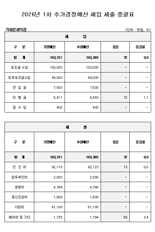 2. 공고사항 : 2026년 각화문화의집 1차 추가경정 세입·세출 예산서
