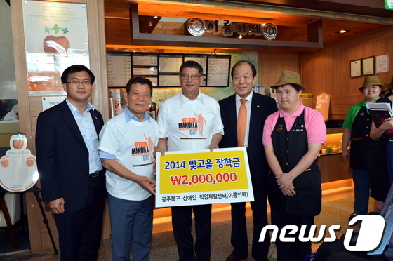 광주시청 1층 시민홀에 자리한 커피전문점 '이룸카페'가 18일 오전 빛고을장학재단에 장학성금 200만원을 기탁했다. 광주 북구 장애인 직업재활센터가 운영하는 '이룸카페'는 2012년부터 해마다 어려운 환경에서 공부하고 있는 학생들을 위해 장학성금을 기탁하고 있다.